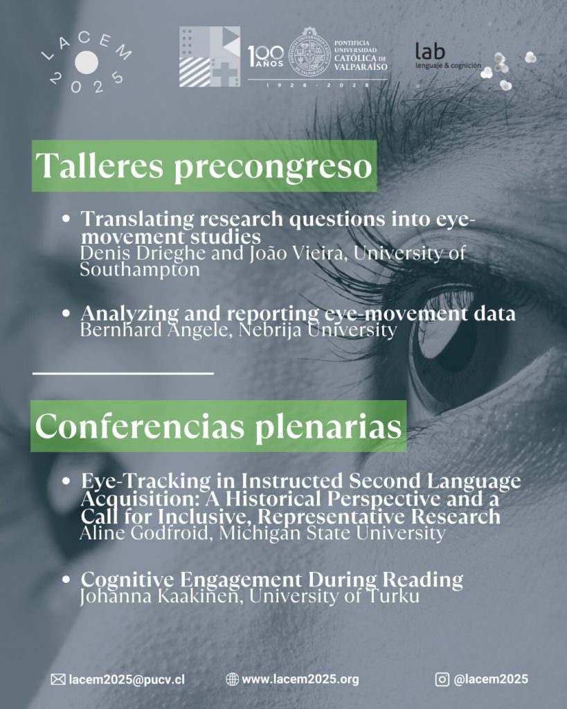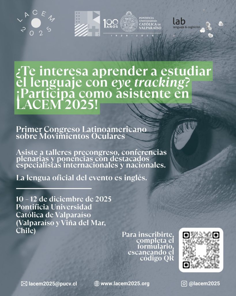 Join us as an attendee at the First Latin American Conference on Eye Movements – LACEM 2025, taking place from December 10–12, 2025 at the Pontificia Universidad Católica de Valparaíso (Viña del Mar – Valparaíso, Chile).